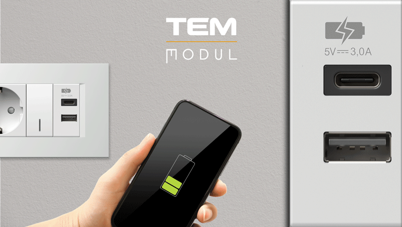 Priključnica (napajanje) USB dvostruka za ugradnju na nosače TEM MODUL, 1x USB-C, 1x USB-A