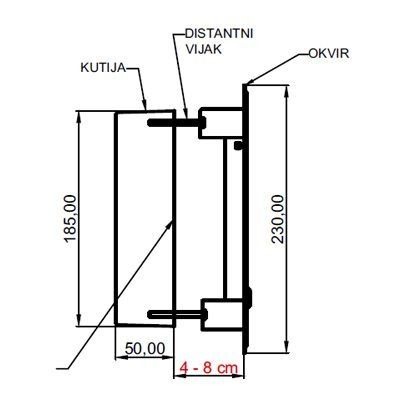 Opis: sastavljen je od plastične kutije veličine 135x180x50 otporne na atmosferske utjecaje i okvira izrađenog od nehrđajućeg čelika. Kutija se ugrađuje u zid objekta 4-8 cm od površine fasade. Okvir se montira nakon završetka fasade distantnim vijcima na već ugrađenu plastičnu kutiju, ili ako nema kutije direktno na zid. Prošireni okvir pokriva ostavljeni otvor a distantni vijci omogućavaju pritezanje okvira u rasponu od 4-8 cm