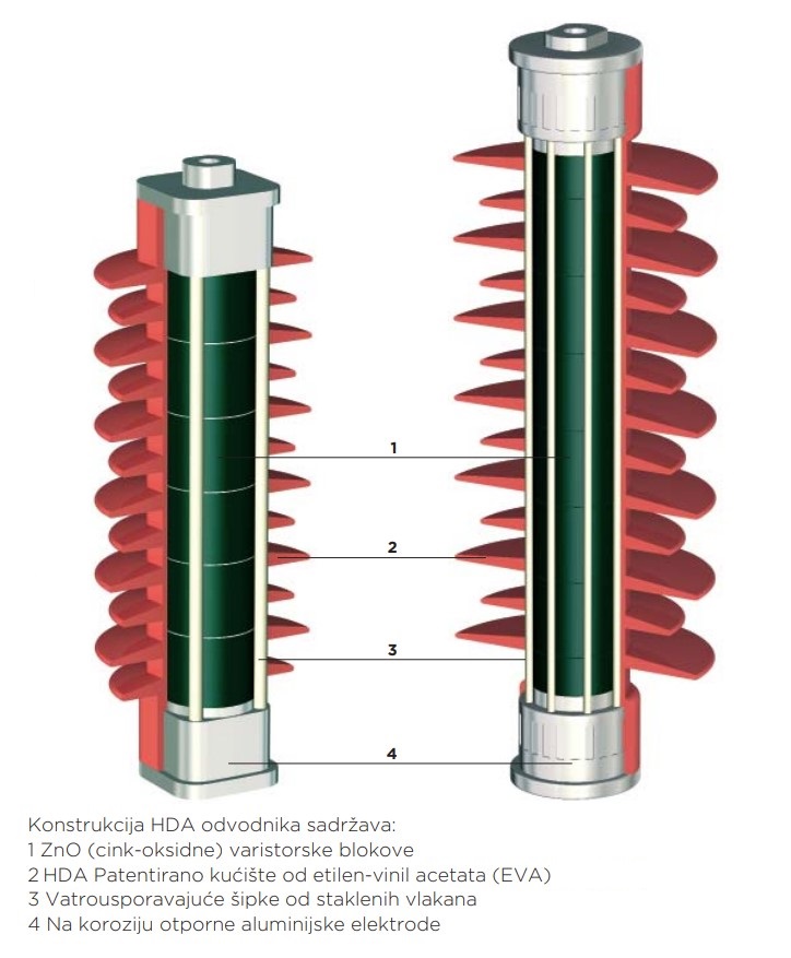 - HDA odvodnici prenapona s EVA kućištem konstruirani su i ispitani kako bi udovoljili najzahtjevnijim uvjetima okoliša na mjestu ugradnje, te kako bi potpuno bili u skladu sa zahtjevima norme IEC 60099-4