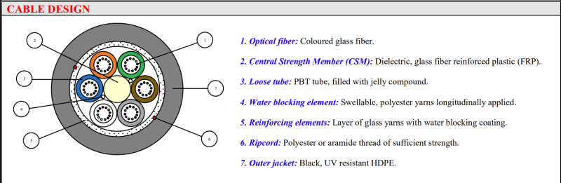 Primjena: u LAN, MAN i telekomunikacijskim sustavima. Predviđen je za vanjsku primjenu, vodootporan i otporan na UV-zračenje. Staklene niti daju mu otpornost na vlačna istezanja, a materijal kabela pruža zaštitu od glodavaca. Može se polagati direktno u zemlju.